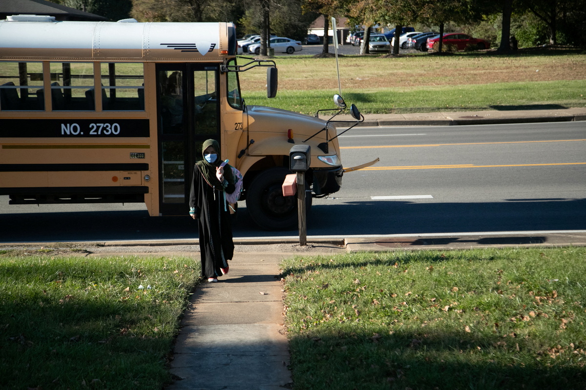 Zuleikha Zardan, 15, walks from the school bus, near her home in Bowling Green, Kentucky, U.S., November 5 2021. The Zadran family, Afghan refugees fleeing the Taliban, came to Bowling Green after a spell at a New Mexico military base. They secured a house and the children have been sent to school, with the help of local resettlement agency, the International Center. REUTERS/Amira Karaoud