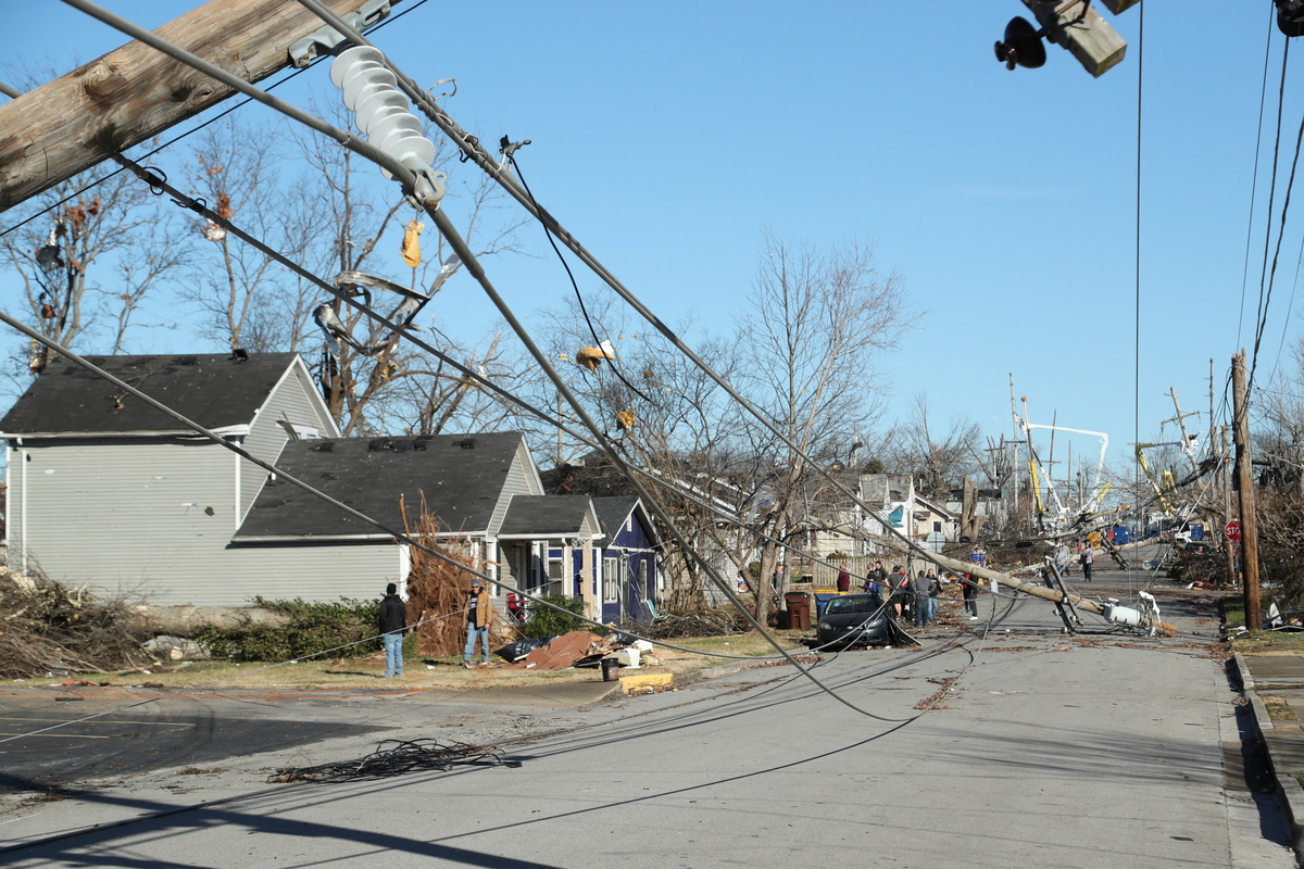 Power lines are seen in the middle of the street after tornadoes ripped through the town in Bowling Green, Kentucky, U.S., December 12 2021. The twisters that tore through Kentucky this month jolted the Afghans' sense of security. They were confounded by the 1 a.m. sirens that reminded them of Kabul and shocked by the uprooted trees, roofs ripped off houses and deaths in one neighbourhood home to many immigrants. REUTERS/Amira Karaoud