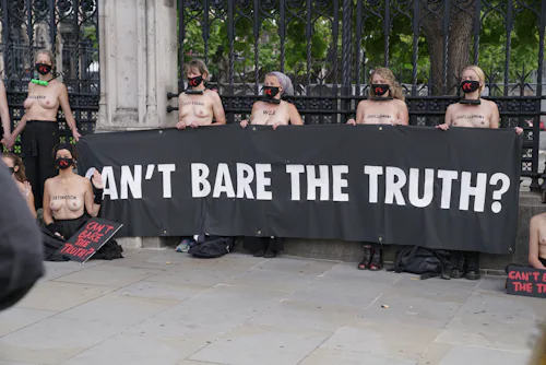 On a chilly March morning, 20-year-old student Eden stood in a crypt beneath a church in Central London. Joining in a sharing circle with a group of other women, of all ages and backgrounds, they discussed the day’s agenda. The stenciled paint across their bare chests read “climate rape,” “climate justice,” and “climate emergency.” After covering up to walk to Waterloo Bridge, Eden stripped along with 31 other women and proceeded to brave the elements, despite the freezing rain, for two hours. The topless protest, held on International Women’s Day 2020 by Extinction Rebellion, aimed to draw attention to the disproportionate impact of climate change on women across the world.