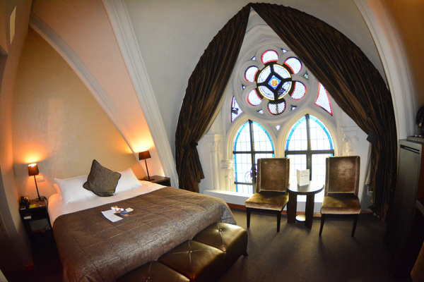 A harbinger of surprises to come when you stay at this boutique hotel _ transformed from a Franciscan monastery dating to 1867. The stained-glass projection, it turns out, is of one of the few original windows that have been preserved but can no longer be seen in the hotel, which had to be renovated and repurposed under the extremely strict preservation guidelines of the Belgian government. Monsumenten en Landschappen, the government's architectural organization, required that the historic value of the monastery, which eventually fell into disuse when there were not enough monks to sustain it, be preserved in all respects. One of the stipulations was that the circular stained-glass rose window above the main entrance remain visible in its entirety. The columns, the choir and the altar also had to be retained. It was a challenging _ sometimes almost impossible _ project. But the executives at Martin's Hotels were used to such situations. Architectural challenges are de rigueur when turning historic buildings into modern hotels.