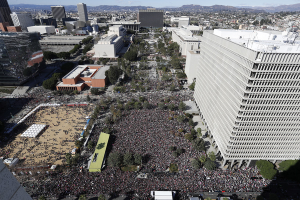 In Los Angeles, crowds gathered in Pershing Square for a rally before marching to Grand Park in front of City Hall.