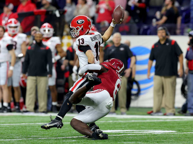 And so there he went, carving through Bama’s secondary. Down 18–13, Bennett hit Jermaine Burton for 18 yards and then Kenny McIntosh for 10. He was sacked before launching a perfectly placed pass to Adonai Mitchell in the corner of the end zone—a rollicking, lead-taking 40-yard touchdown. A series later, while nursing a 19–18 lead, the Bulldogs got a defensive stop and then marched down the field for a back-breaking drive. Bennett handed off five straight times, Georgia backs gained 32 yards and then the QB capped it with a 15-yard screen pass to tight end Brock Bowers for an eight-point lead.