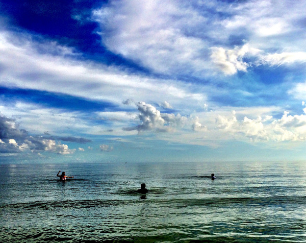 As the morning waned and the sun warmed, the kids ventured farther from that safe place where the sand meets the surf, and it wasn't long before all three of them were neck-deep in the ocean for the very first time, alternating leaping and diving like the dolphins we hoped we'd see in the wild.