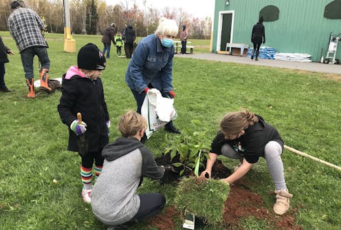 In fall 2020, in the COVID-19 pandemic, a student group in Northport, N.S., created an outdoor space for their school community. Prior to this, the school did not have a physical outdoor seating area or place for the students and staff to connect with nature, despite its rural location.