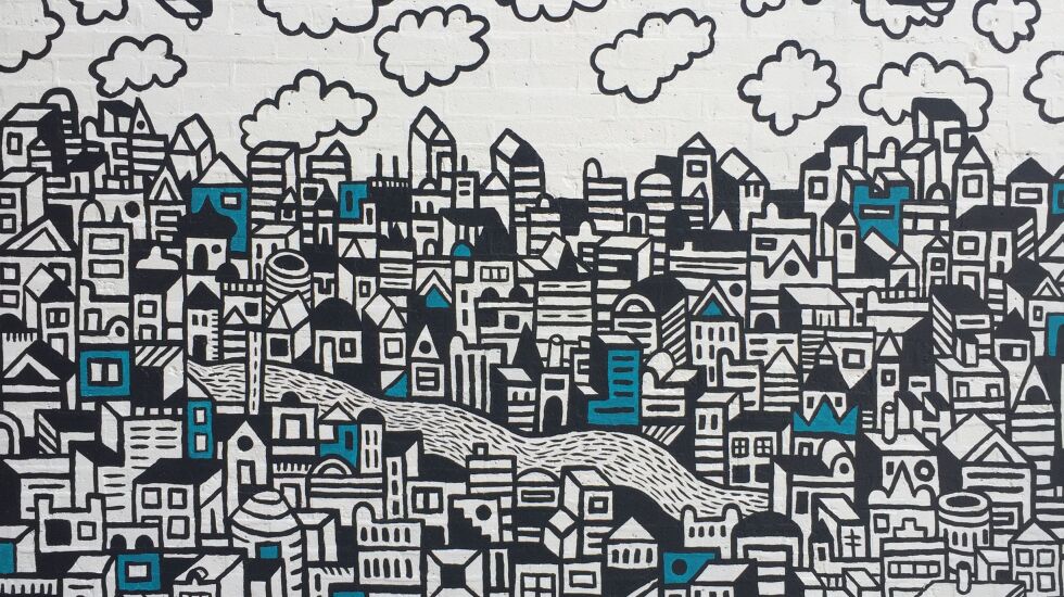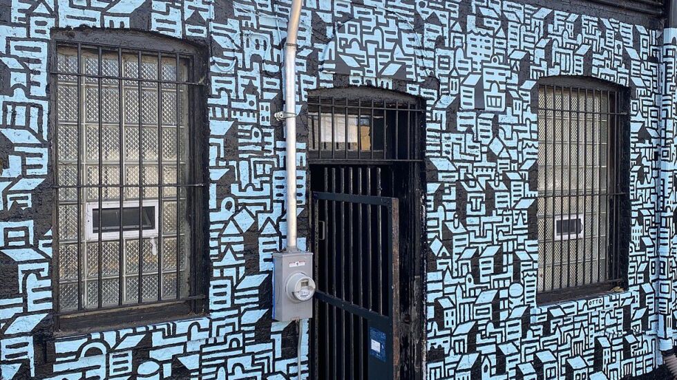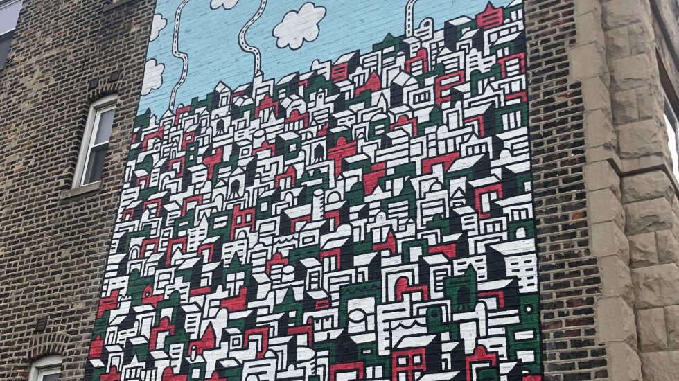 About two miles away in Pilsen, similar silhouettes make up another cityscape, but this one shows a denser neighborhood portrayed in the colors of the Mexican flag — a nod to the community that makes up much of the area.