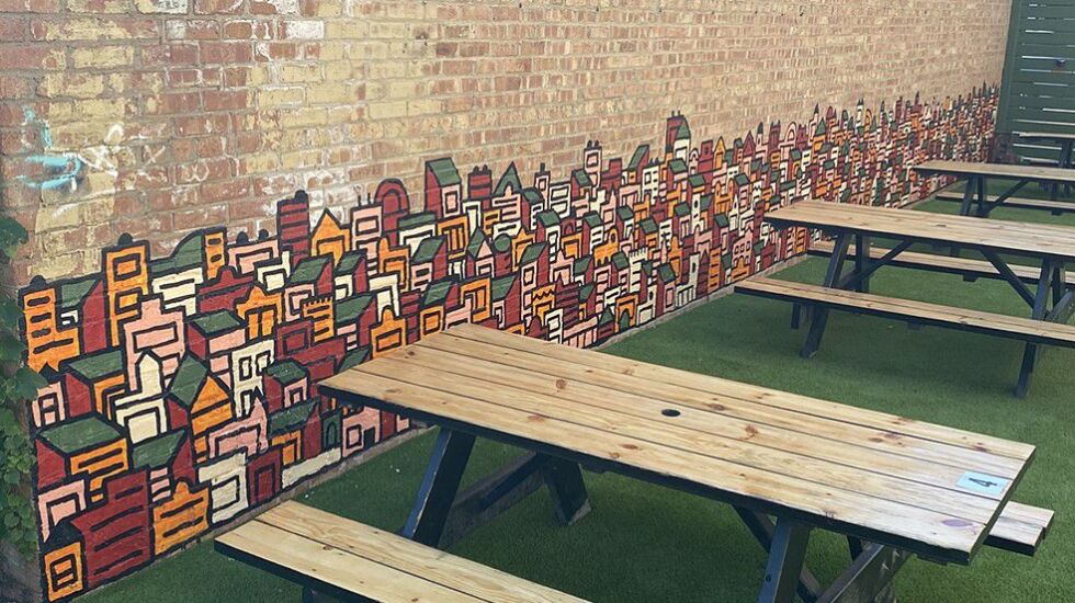 He also has been commissioned to do work in businesses across the city — customers of Outside Voices in Logan Square find themselves sitting next to a cityscape mural of his that sprouts from the ground and spans the length of the outdoor patio.