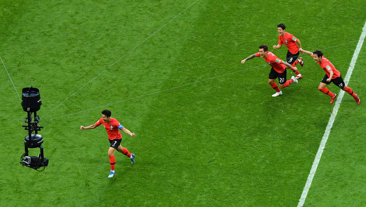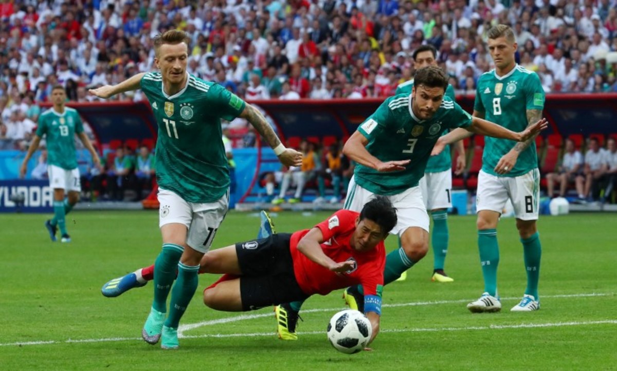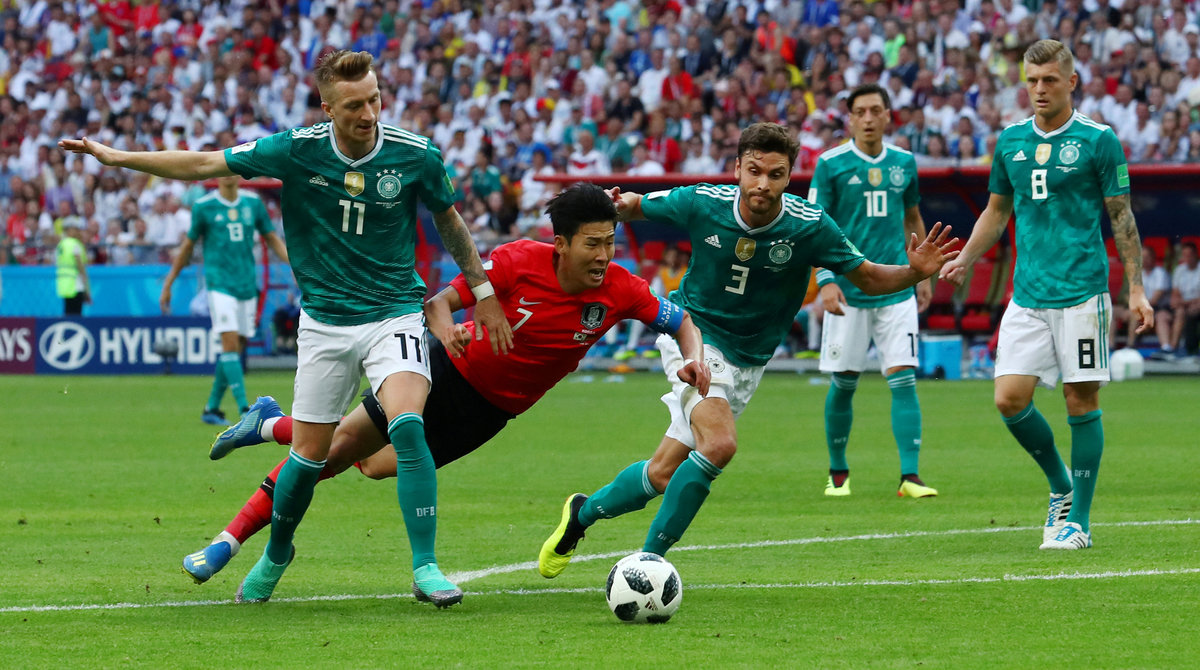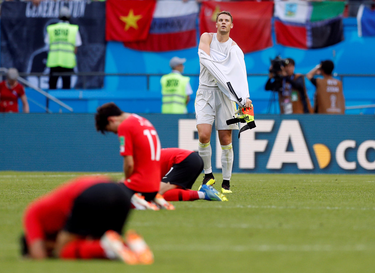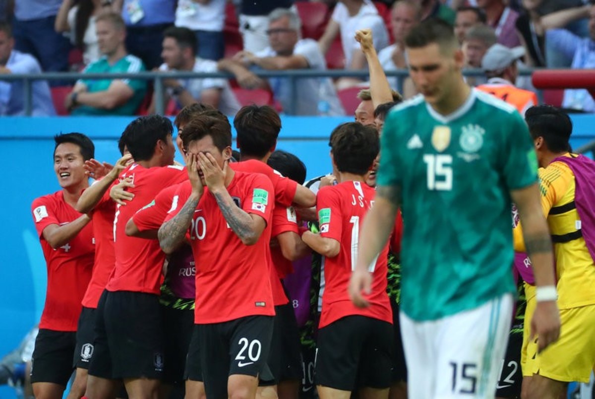 Soccer Football - World Cup - Group F - South Korea vs Germany - Kazan Arena, Kazan, Russia - June 27, 2018 South Korea celebrate their first goal scored by Kim Young-gwon REUTERS/Dylan MartinezSoccer Football - World Cup - Group F - South Korea vs Germany - Kazan Arena, Kazan, Russia - June 27, 2018 Germany's Manuel Neuer looks dejected after the match as they go out of the World Cup REUTERS/John Sibley Soccer Football - World Cup - Group F - South Korea vs Germany - Kazan Arena, Kazan, Russia - June 27, 2018 Germany's Mesut Ozil looks dejected after the match REUTERS/Michael Dalder Soccer Football - World Cup - Group F - South Korea v Germany - Berlin, Germany - June 27, 2018 - Germany fans react as they watch the match at a public viewing area at Brandenburg Gate. REUTERS/Hannibal Hanschke Soccer Football - World Cup - Group F - South Korea vs Germany - Kazan Arena, Kazan, Russia - June 27, 2018 South Korea's Son Heung-min in action with Germany's Marco Reus and Jonas Hector REUTERS/Pilar OlivaresSoccer Football - World Cup - Group F - South Korea vs Germany - Kazan Arena, Kazan, Russia - June 27, 2018 South Korea coach Shin Tae-yong during the match REUTERS/Pilar Olivares