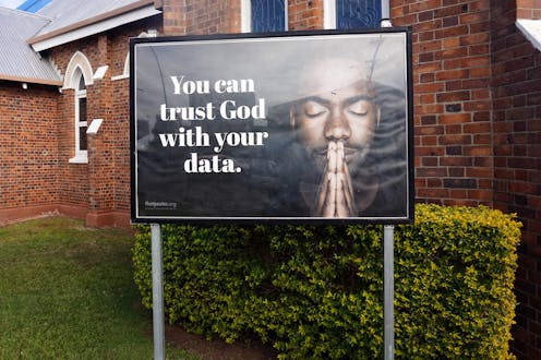 Another poster states, “You can trust God with your data”. As a response to recent scandals of data theft, the message conveys the idea that one’s innermost prayers are safe with God.
