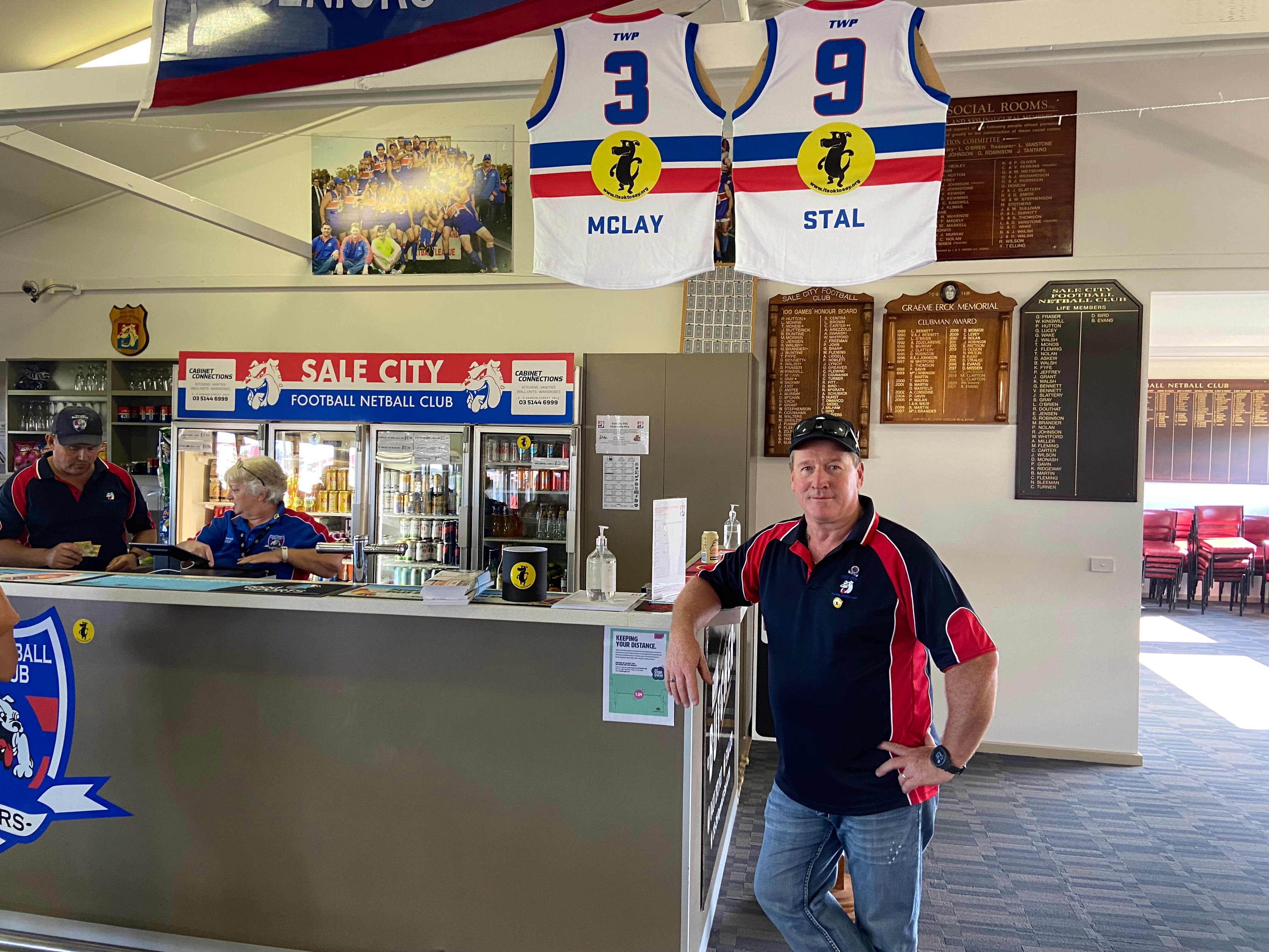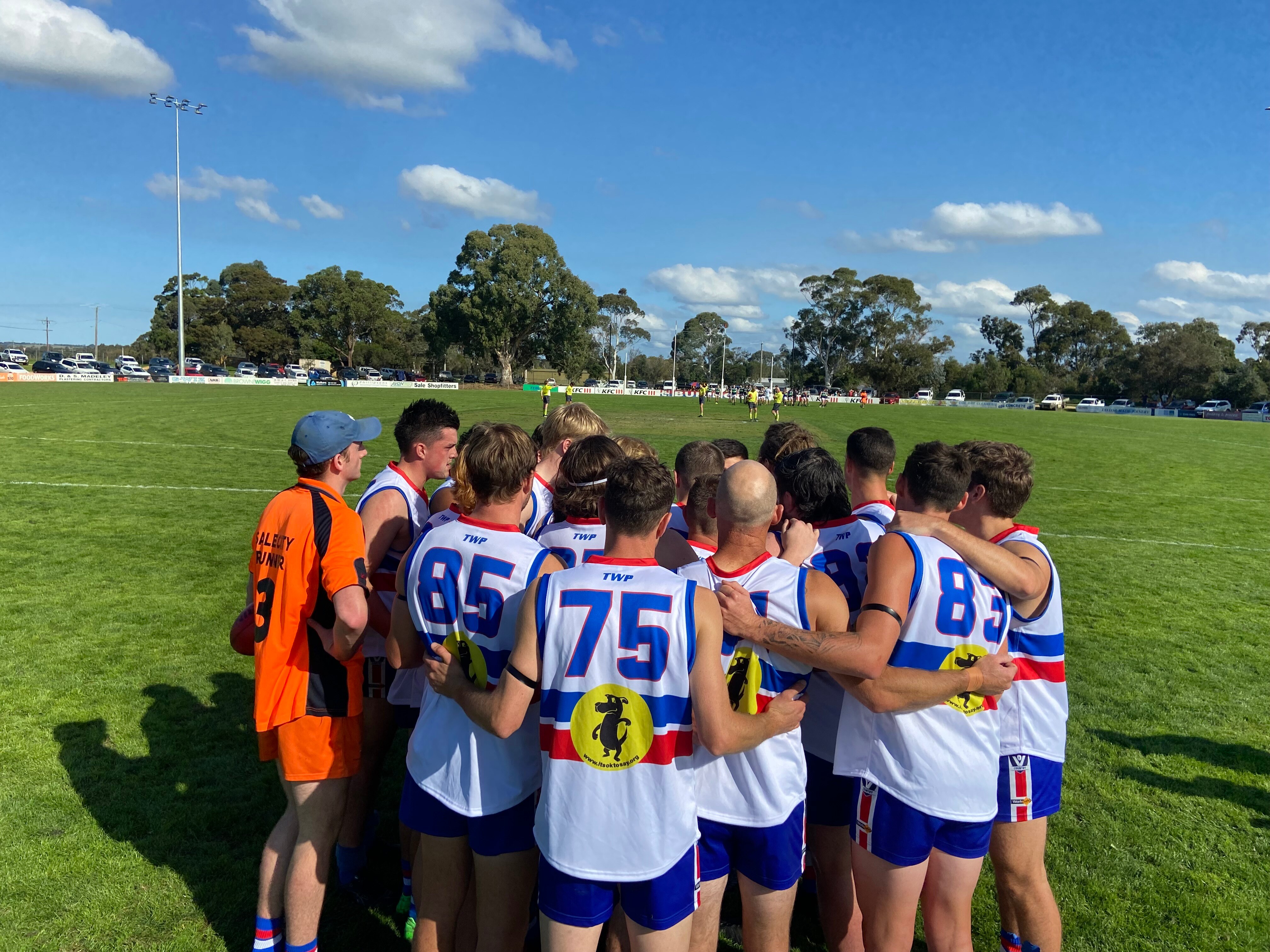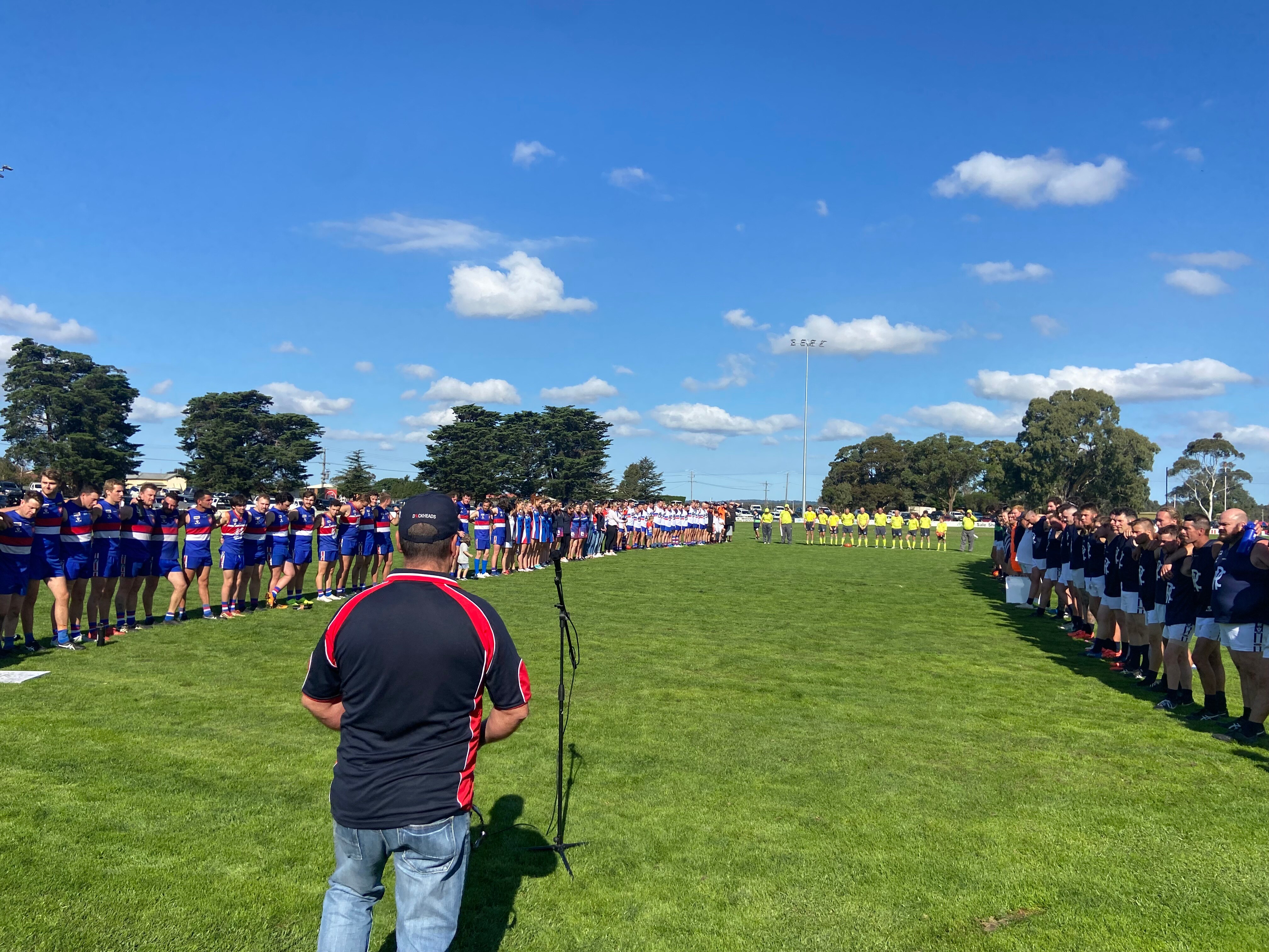 Sale City and Rosedale seniors, reserves, netballers, umpires, mates, family and children lined up squarely to hear stalwart clubman Greg Robinson talk about suicide.