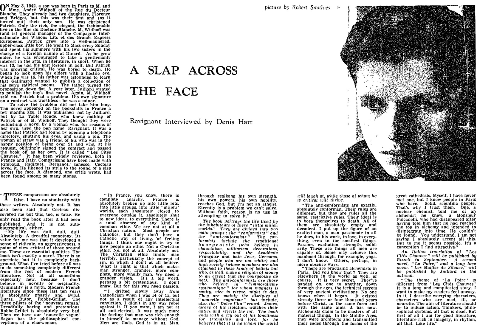 To solve the problem did not take him long. The novel appeared on the bookstalls in France a few months ago. It was published not by Julliard, but by La Table Ronde, who knew nothing of Patrick or of M. Widhoff. They thought they were publishing a novel by a woman who, for reasons of her own, used the pen name Ravignant. It was a name that Patrick had found by opening a telephone directory, shutting his eyes, and using a pin. The woman of straw was a friend of his who was in the happy position of being over 21 and who, at his request, obligingly signed the contract and passed the book off as her own. It is called “Les Cités Chauves.” It has been widely reviewed, both in France and Italy. Comparisons have been made with Rimbaud, Radiguet, Bernanos, Ionesco. Cocteau loved it. He likened its style to the sound of a slap across the face. A diamond, one critic wrote, had been found among so many stones.