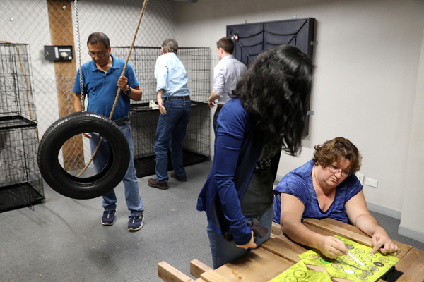The groups dug into the task, connecting via walkie-talkies for occasional clues from the PanIQ Room managers, who monitored their respective efforts from a control room video screen.