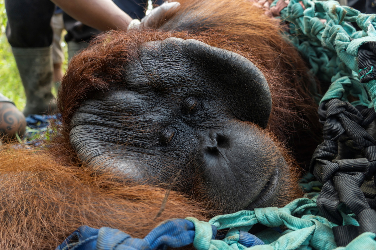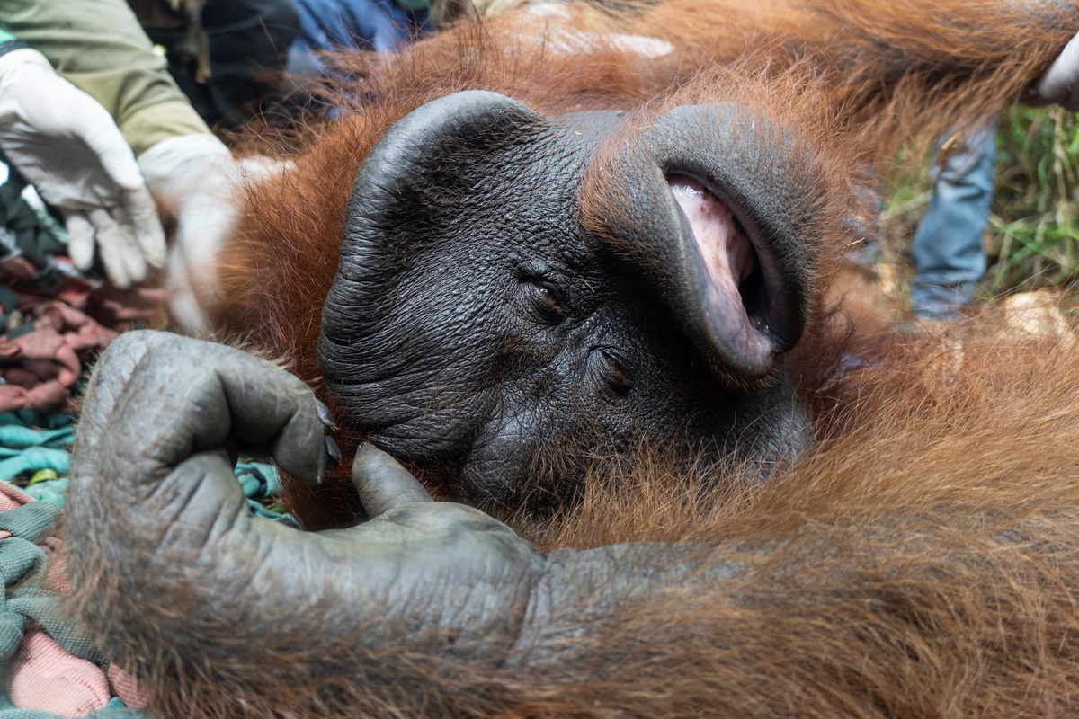 Jala, a male adult orangutan, lies while getting anesthesia for medical tests before being released back into the wild by conservationist group International Animal Rescue (IAR) Indonesia and country's environment and forestry ministry agency to the conservation forest of Tanagupa, part of Gunung Palung National Park, in North Kayong regency, West Kalimantan province, Indonesia, May 4, 2021. Courtesy of International Animal Rescue (IAR) and Indonesia's Environment and Forestry Ministry (KLHK)/Handout via REUTERS