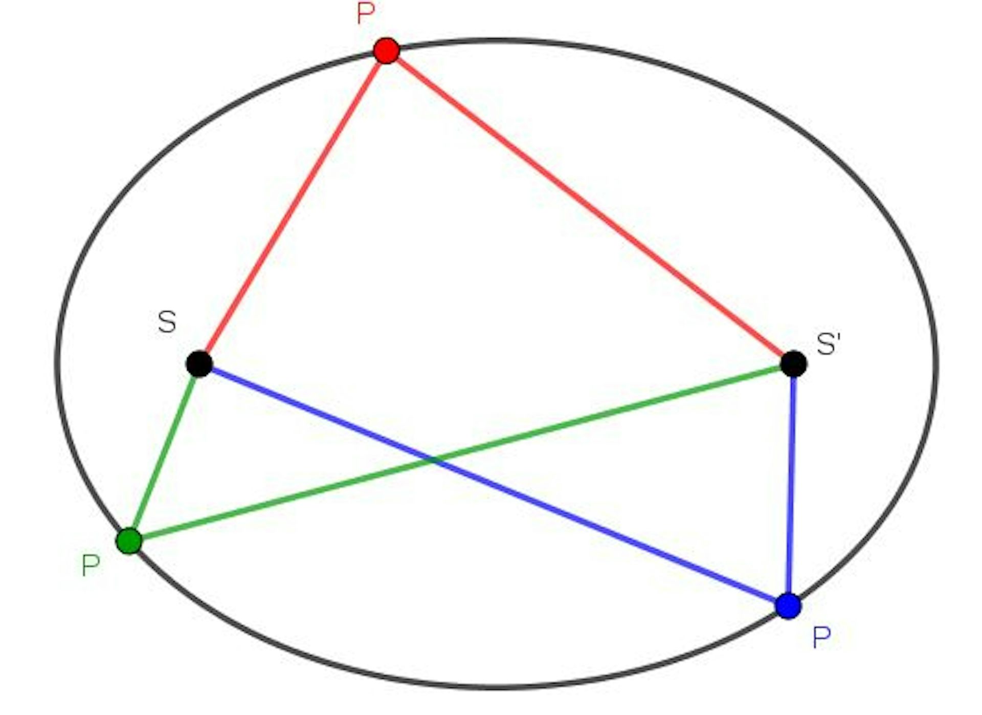 A defining property of an ellipse is that, for each point on it, the sum of the distances from the point to the two focal points (the two sticks in the drawing) is constant. We could even say this more precisely: an ellipse is a curve in a plane surrounding two focal points such that the sum of the distances to the two focal points is constant for every point on the curve. This description may be enough for some purposes, but people might try to interpret what it means visually, or to test it out to see how it relates to a particular ellipse or to turn the description into an equation.