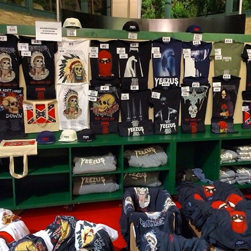 Through his 2013 album Yeezus, Kanye set himself apart from cookie-cutter merch. He created his tour line with graphic designer Wes Lang, who’s known for his recognizable work on Metallica merchandise. Under Metallica-esque “Yeezus” type, the tees featured skeletons wearing Native American headdresses or Grim Reaper robes. Several pieces depicted the Confederate Flag — Kanye’s attempt to subvert the racist tropes he tackled throughout Yeezus lyrics, but a huge aesthetic misstep regardless. Despite this controversy, the tour collection was so popular it spurred a more accessible line at Pacsun, where Kanye’s concert tees hung next to streetwear brands like Obey.