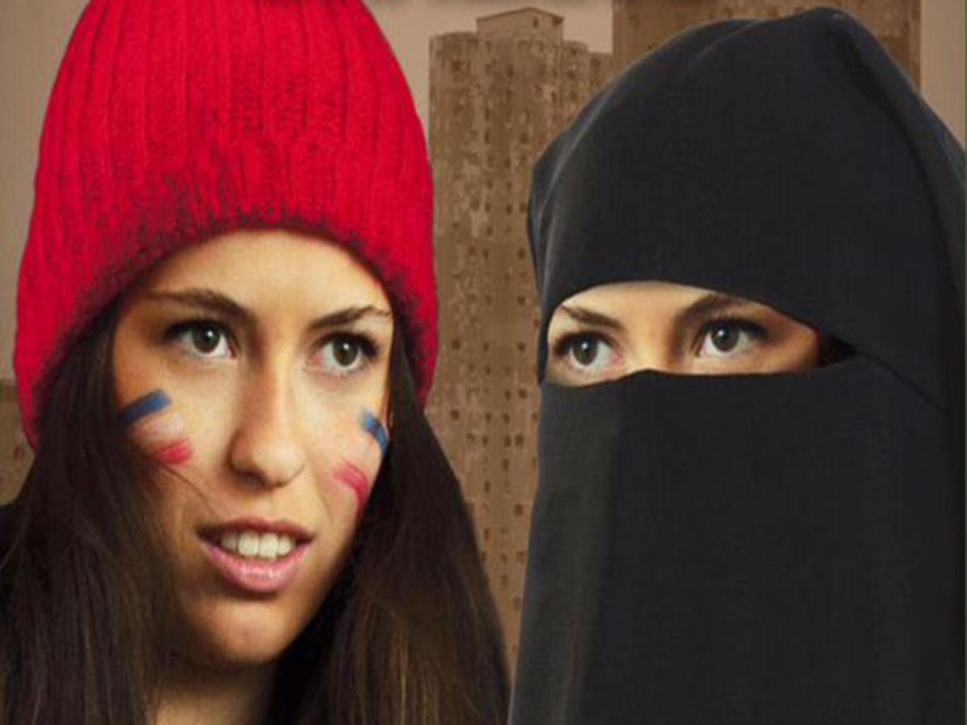The poster shows a veiled woman, and an unveiled woman - probably the same person - with the French tricolore painted on her cheeks, and proclaims: '"Votez Front!"