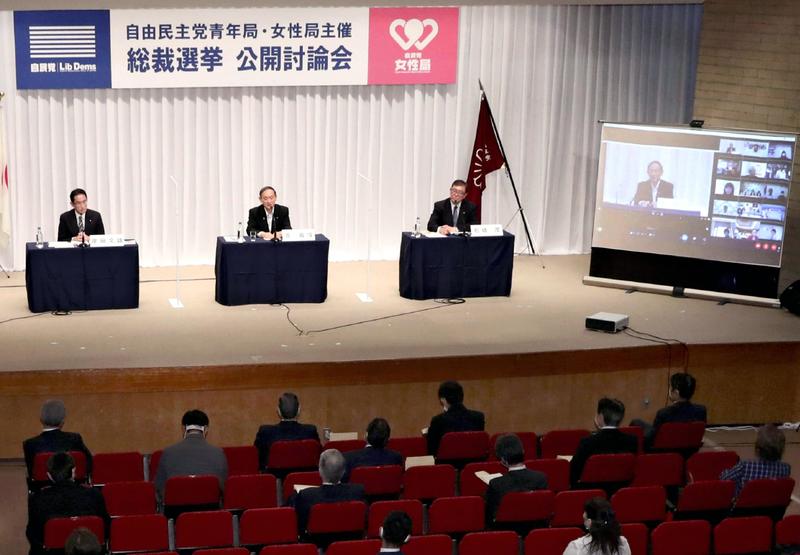 Members of both the youth and women's divisions from prefectures around the nation were also allowed to ask questions through a monitor. The forum is held before every LDP presidential election, but this was the first to include an online audience.