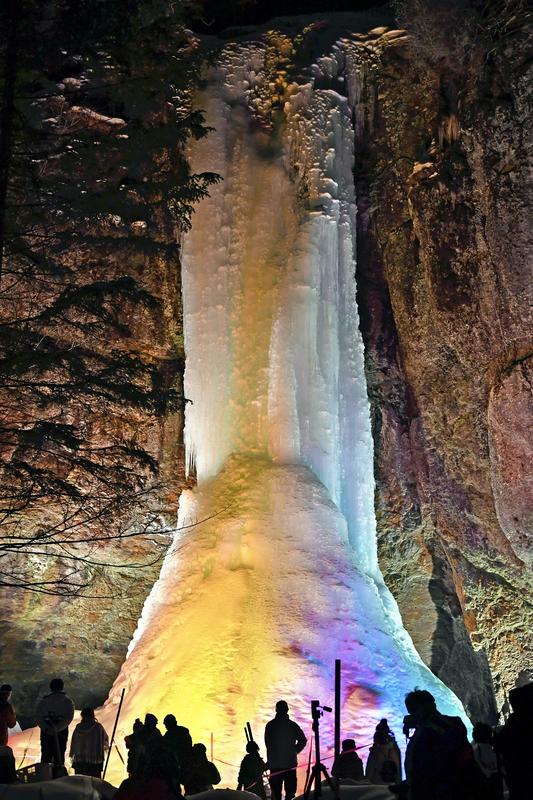 A 28-meter-tall frozen waterfall in Engaru, Hokkaido, towers over a group of tourists on Saturday night, with illuminations enhancing the ethereal spectacle. A group of 25 people arrived at the Yamabiko no Taki waterfall after traveling by bus from a nearby hot spring resort. Saturday's tour was the first held this year, with four more visits planned before the end of the season.