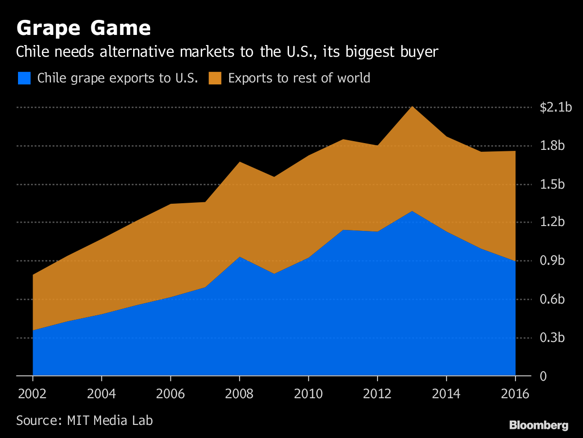 That’s forcing the South American country to look to Asia to sell off its fruit in the latest example of an unexpected market getting caught up in the U.S.-China spat. California grapes get harvested into the fall, but in December -- as those supplies dissipate -- the U.S. turns to Chile for fresh fruit.