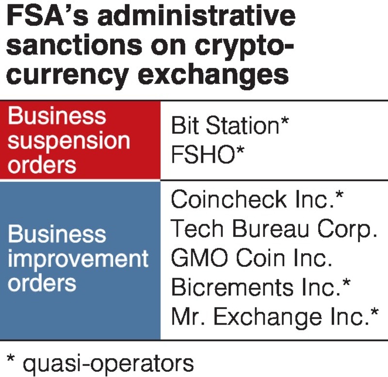 Nagoya-based Bit Station and Yokohama-based FSHO were punished mainly for failing to adequately protect customers. Based on the revised Payment Services Law, the two exchange operators were ordered to suspend all their operations, except for cryptocurrency withdrawals, from Thursday to April 7.