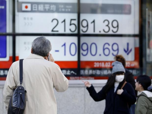 Following the US, Japan’s Nikkei 225 index plunged as much as 7.1 per cent, but recovered some of those losses to close down 4.7 per cent at 21,610.24 on Tuesday.