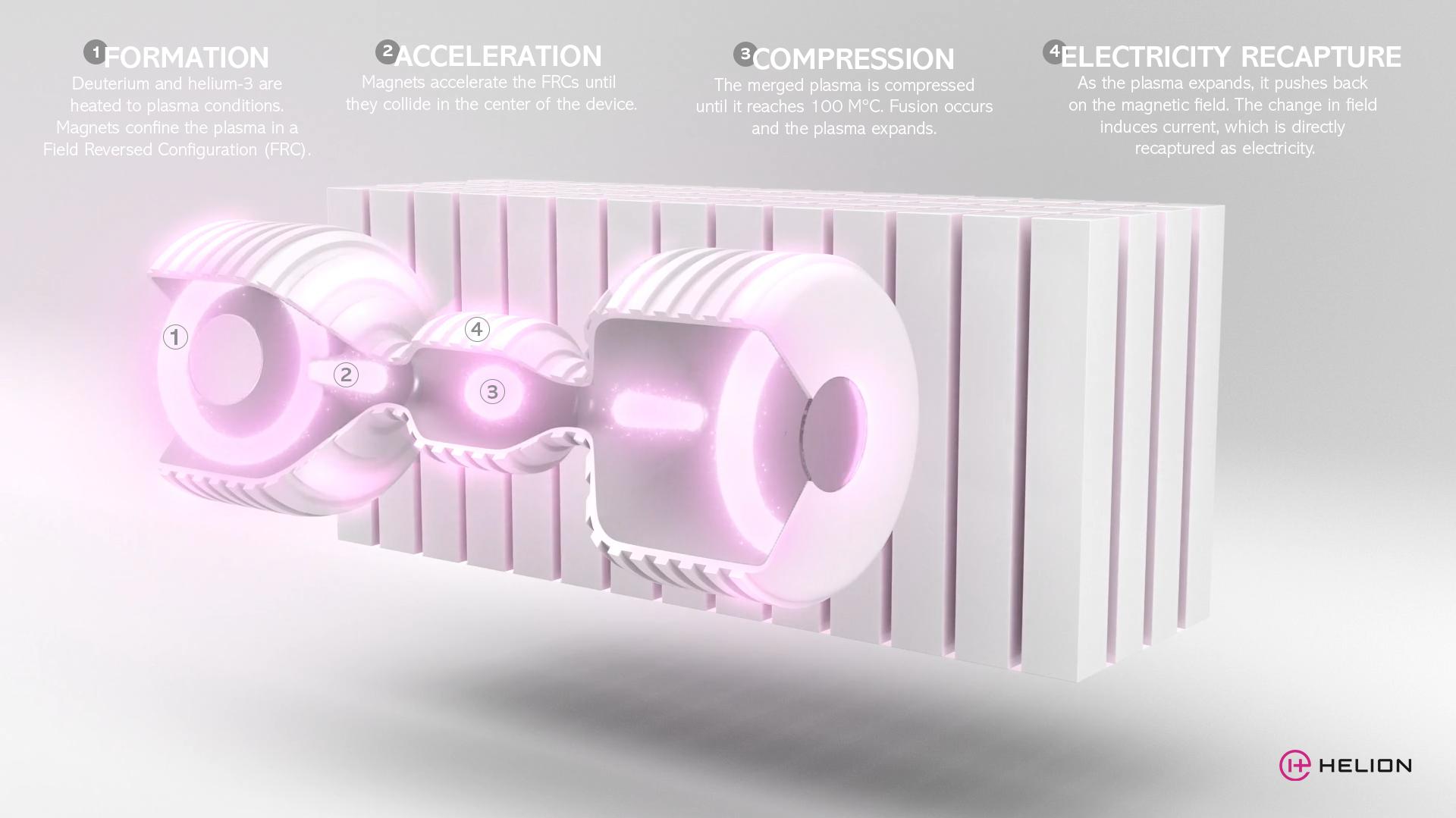 In Helion’s novel system, the energy released in the fusion reactions continuously pushes out against its magnetic containment field, which pushes back — causing oscillations (“like a piston,” says Kirtley) that generate an electric current, which Helion captures directly from the reactor. (For more, read up on Faraday’s law of induction.)
