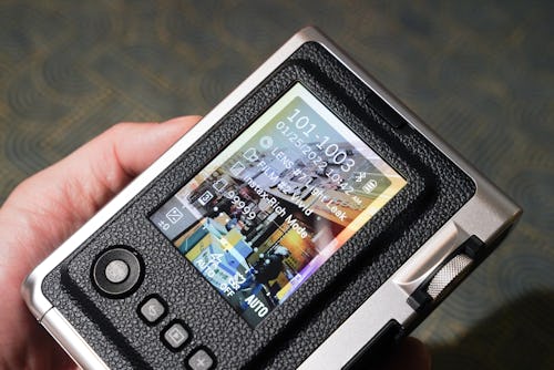 On my first go, I pulled the Instax Mini Evo up to my eye only to realize there is no optical viewfinder below the cold shoe or in the corner like it is in every Mini Instax camera. It took a few shots to break the reflexive habit. I'm glad there's no viewfinder; the ones on other Instax cameras are always off with the framing (usually to the left or right). The LCD is always accurate — what you see is exactly what you get. The buttons beneath the screen are all self-explanatory. Now, the lens ring and effects dial — this is where the fun is.