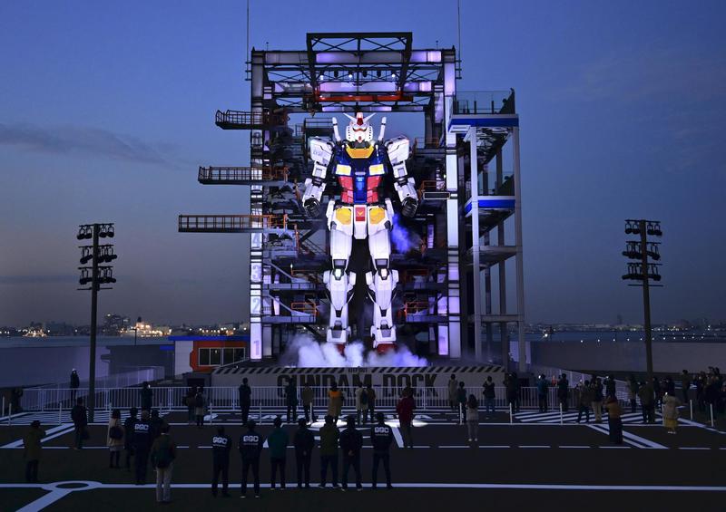 YOKOHAMA -- A full-scale model of a robot from the Japanese anime series "Mobile Suit Gundam" was unveiled to the media at Yamashita Pier in Yokohama for the Gundam Factory Yokohama (GFY) event on Monday, ahead of its official start on Dec. 19.