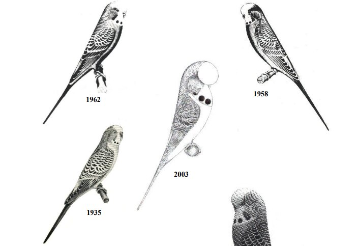 Trends in what constitutes a prize-winning bird have changed over the years from birds that more closely resembled the wild budgie of the 30s to a bird with a dramatic feathered crown in 2023.