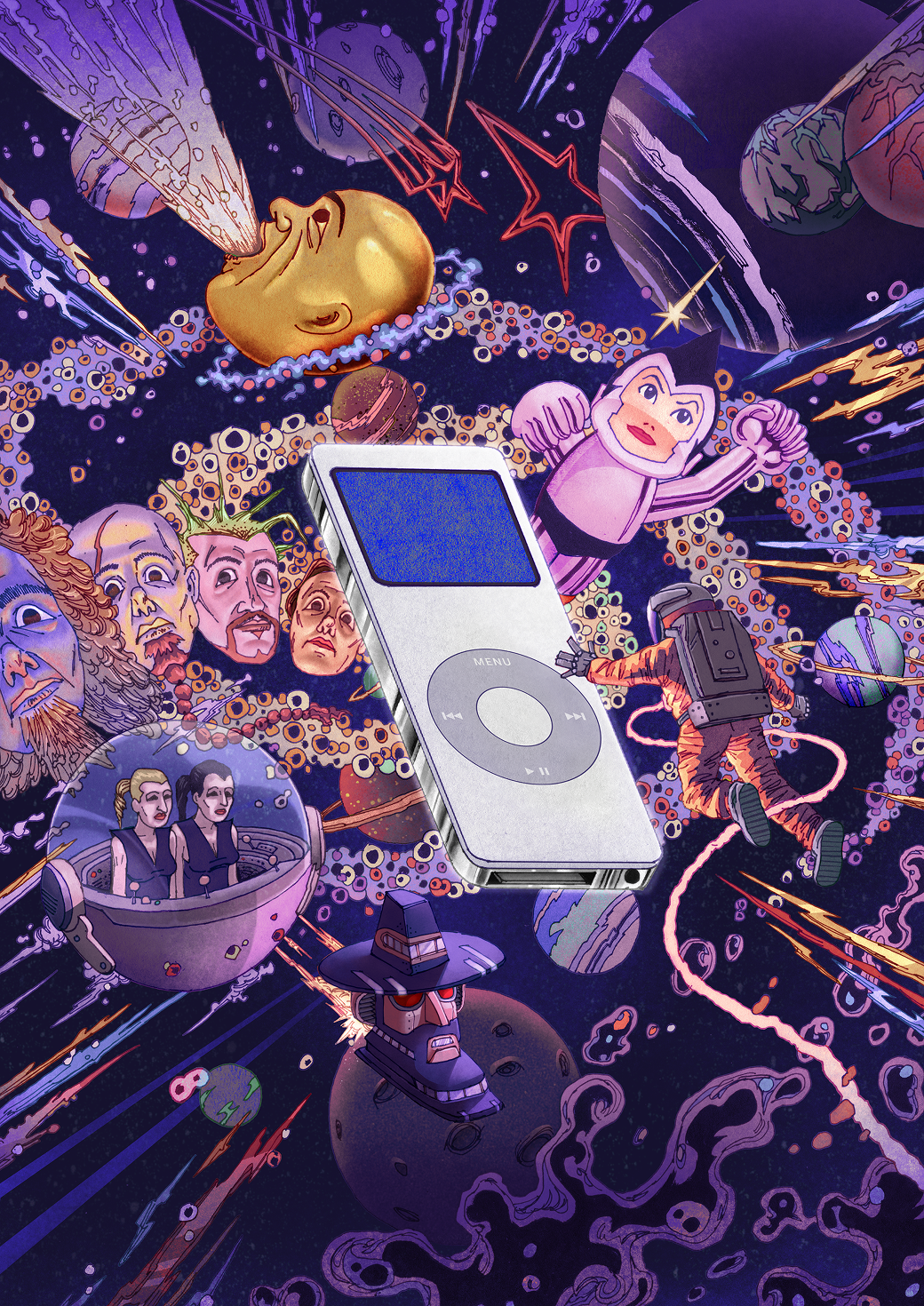 Here, the Nano floats at the centre of a cluttered Y2K universe, full of album cover references from the time. The Nano stands out like the beacon it was at the time.