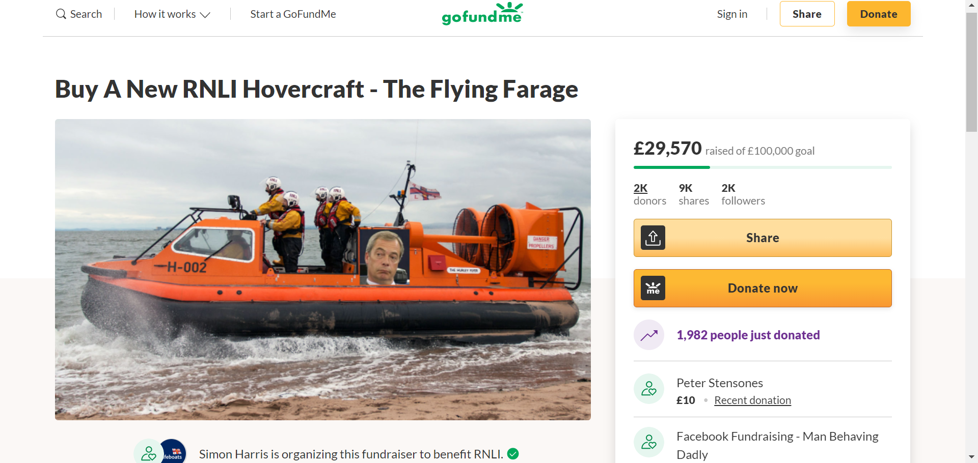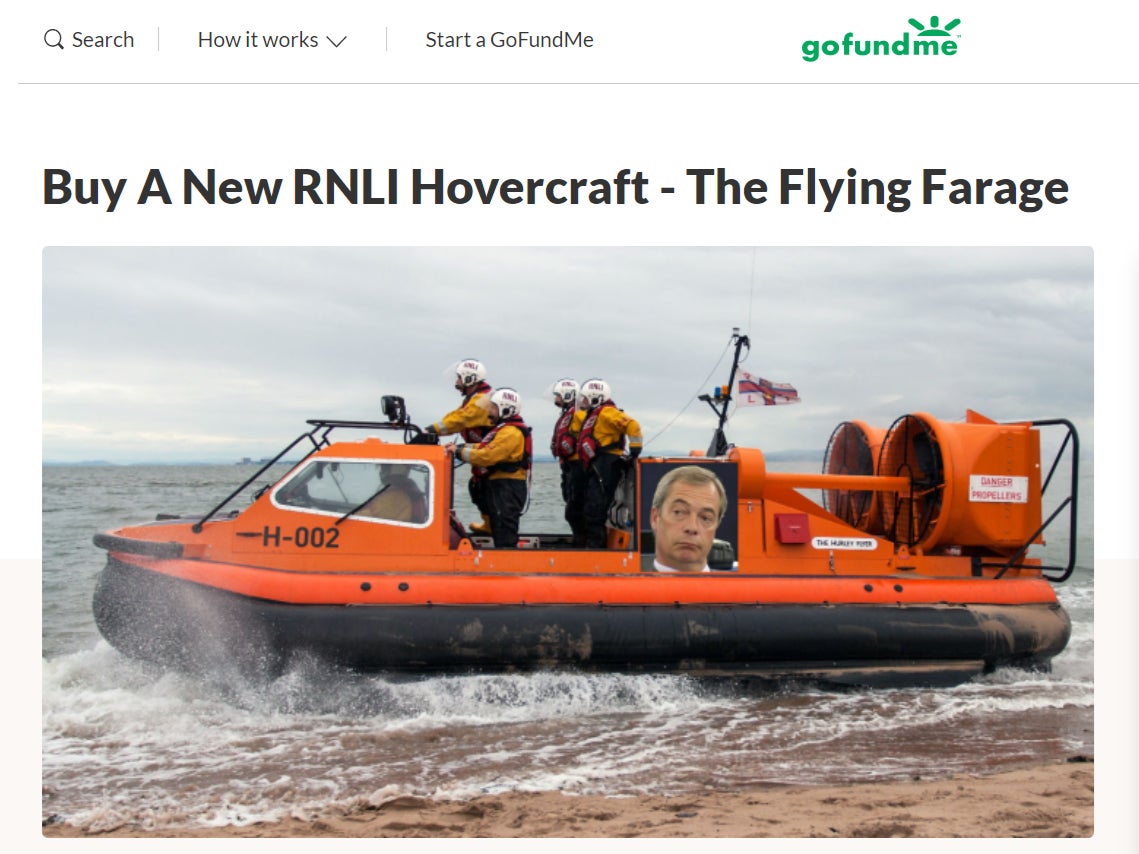 The GoFundMe – named “Buy A New RNLI Hovercraft - The Flying Farage” – was created shortly after and has already received more than £40,000 of its £100,000 target from nearly 3,000 donors.
