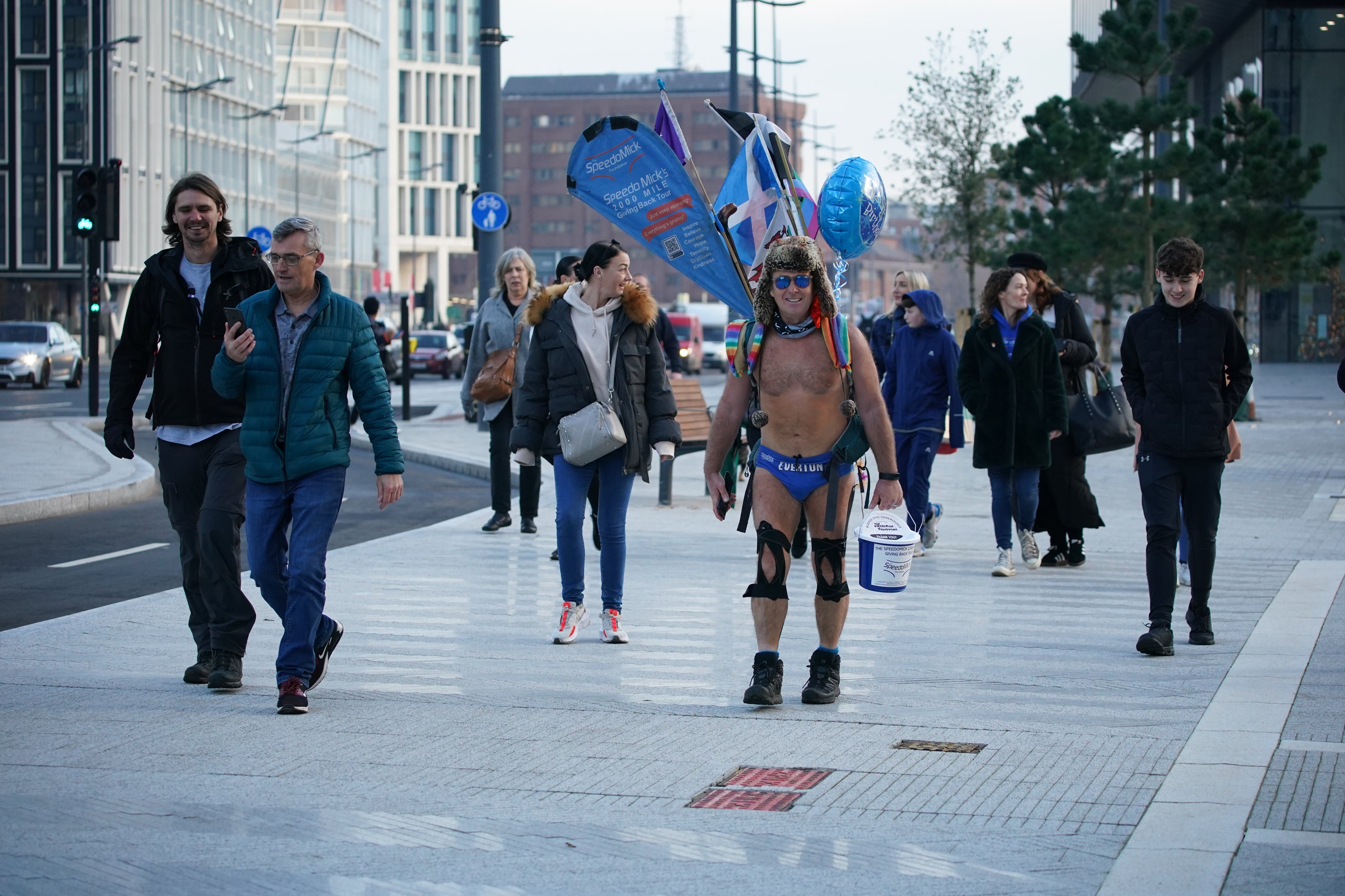 Everton fan Michael Cullen, now more commonly known as Speedo Mick, celebrating his 57th birthday on Friday by crossing a finish line at Liverpool’s Pier Head at the end of his Giving Back Tour, which has seen him walk across the UK and Ireland in snow, wind and rain, wearing only his swimming trunks.