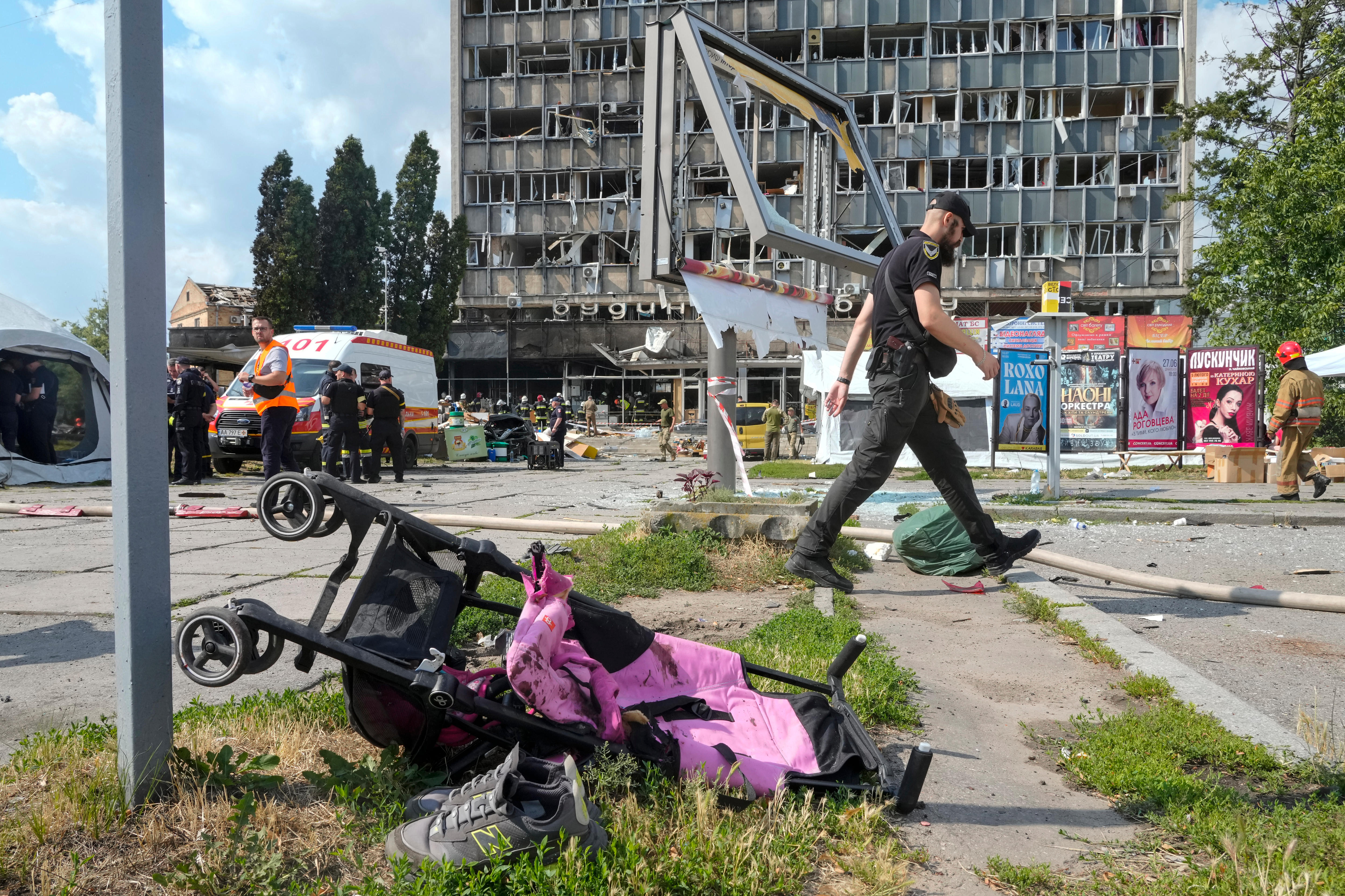 After the Russian missile strike, Ukraine's emergency services shared photos showing her lifeless body on the ground next to her blood-stained stroller.