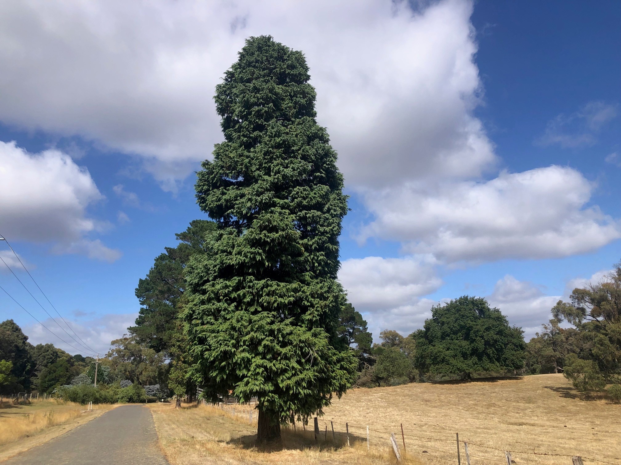 Two Californian redwoods stand rigidly to attention along the old main road at Eganstown north-west of Melbourne.