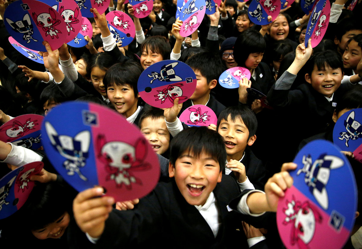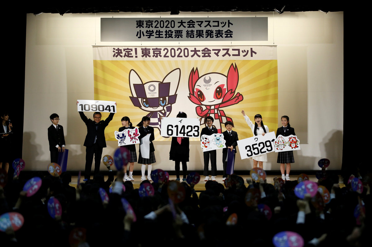 Chosen by schoolchildren across Japan and announced before a gymnasium of cheering pupils in Tokyo, the as yet unnamed blue character will be the mascot for the Olympics and the pink cherry blossom-inspired one for the Paralympics.