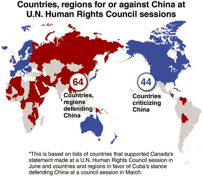 During a session of the U.N. Human Rights Council in Geneva on June 22, Canada, a G7 member state, expressed concern about the human rights situation in China's Xinjiang Uygur Autonomous Region, Hong Kong and Tibet. Forty-four countries, including Japan, the United States, Australia and European countries, sided with Canada.