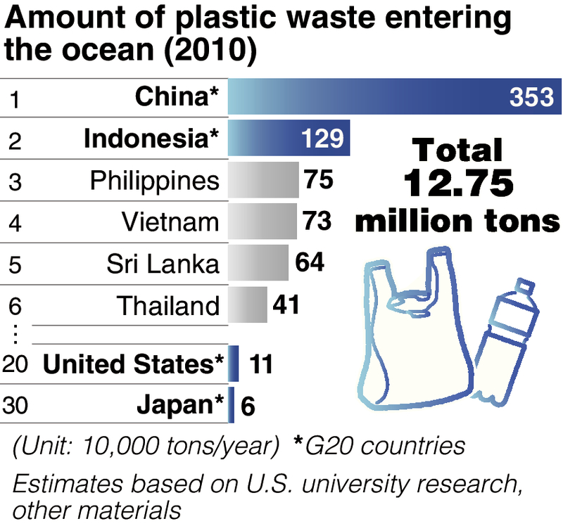According to U.S. university researchers and others, it is estimated that up to 12.75 million tons of plastic waste poured into oceans around the world in 2010. Of that waste, 3.53 million tons came from China and 1.29 million tons from Indonesia. These two G20 countries are major generators of plastic waste, accounting for nearly 40 percent of all such waste that has entered the oceans.
