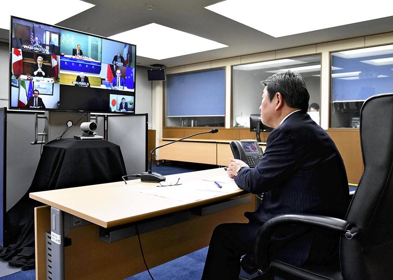 Foreign Minister Toshimitsu Motegi participates in a teleconference with foreign ministers of the Group of Seven nations.