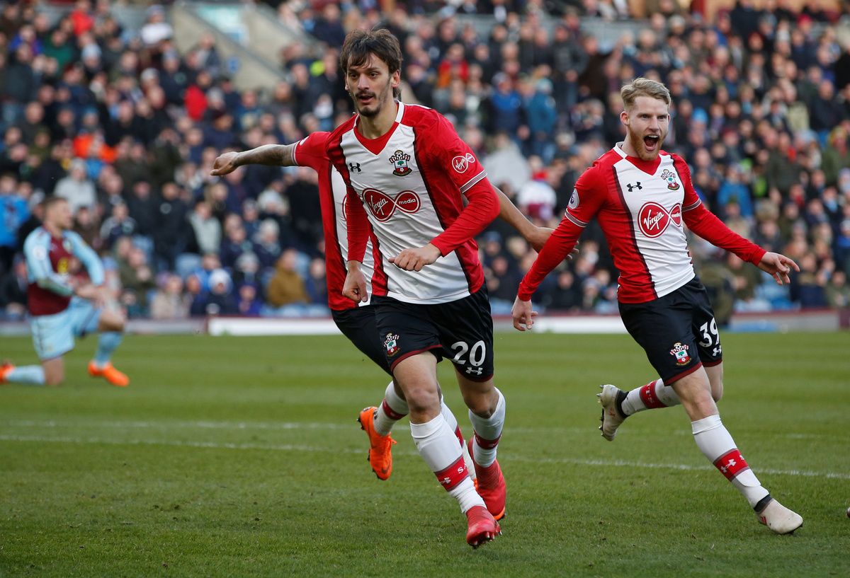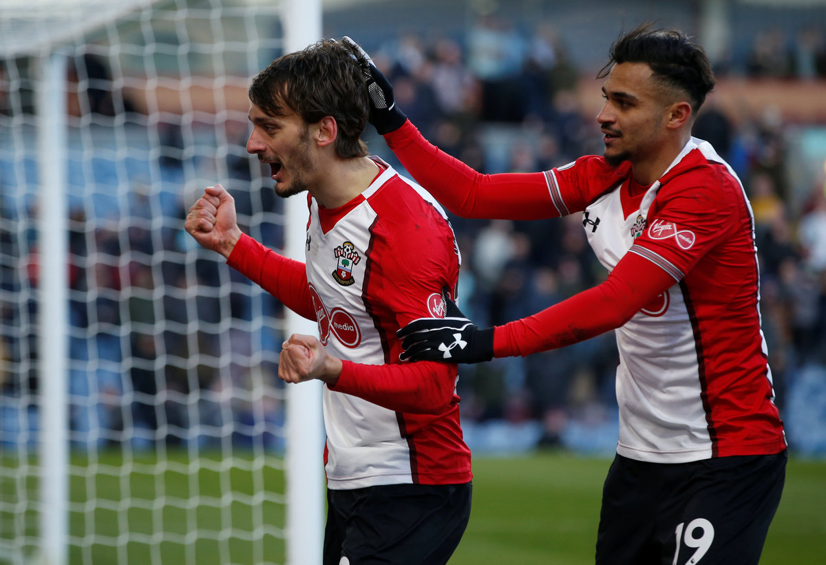 Soccer Football - Premier League - Burnley vs Southampton - Turf Moor, Burnley, Britain - February 24, 2018 Southampton's Manolo Gabbiadini celebrates scoring their first goal with Josh Sims REUTERS/Andrew Yates