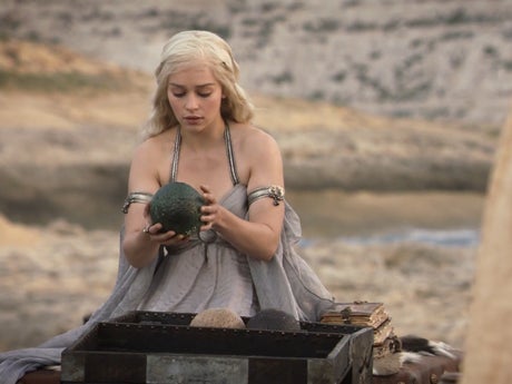 “This one-of-a-kind bespoke creation is symbolic of Daenerys’ dragon eggs while intertwining subtle nods to her stand-out costumes which celebrate the landscape around her and her evolving story arc,” adds the description.