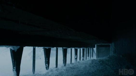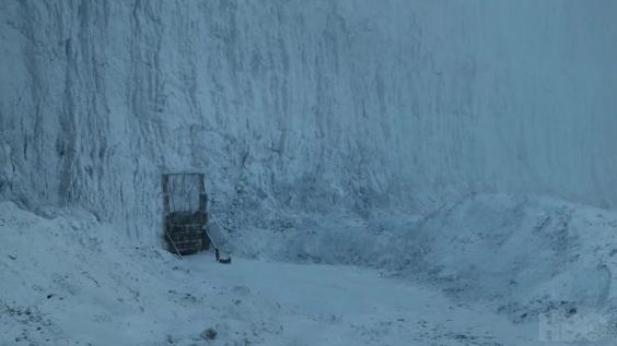 Bran Stark and Meera Reed finally reaching the Wall, its gate appearing to open and let them in