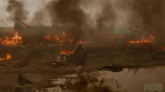 Jaime riding through a fiery battlefield, Lannister flag ominously ablaze in the background.