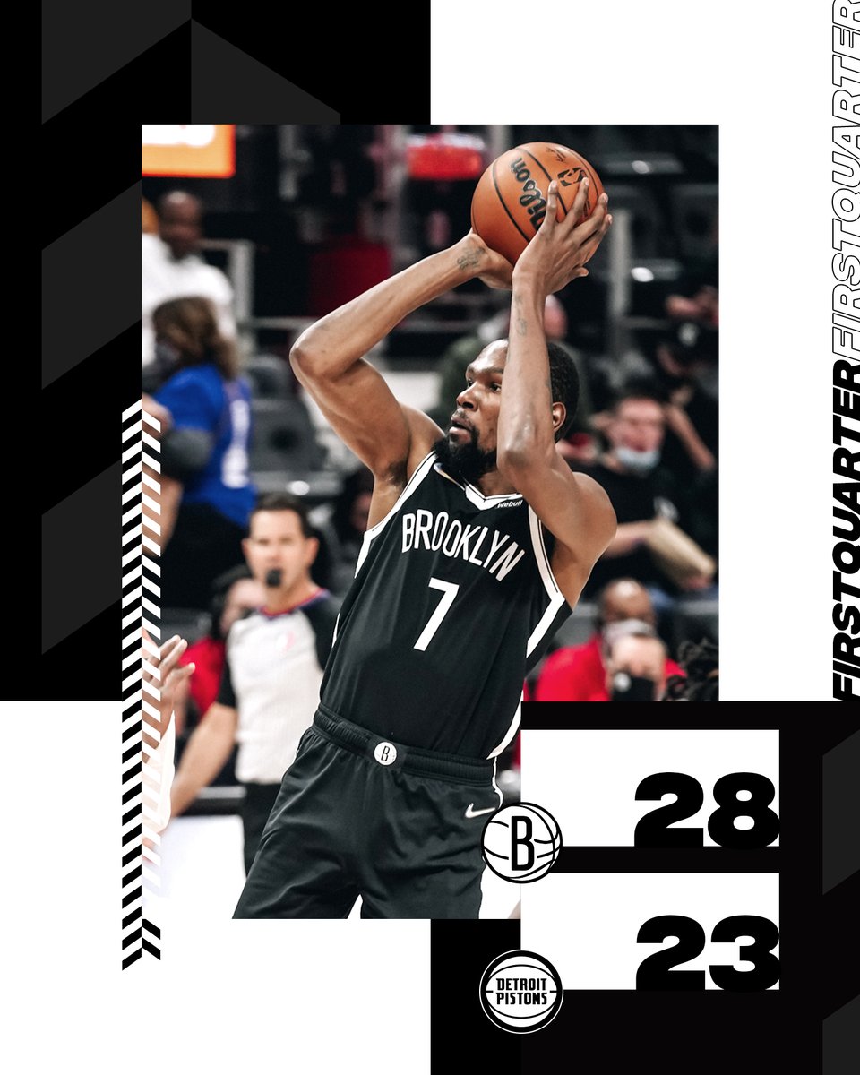 END OF 1Q: Nets 28, Pistons 23. Cade Cunningham with a game-high 9 points. Detroit is 8-of-21 from the field and 2-of-8 from 3. Brooklyn has 53-50-80 splits. Not sure how this is a five-point game lol – 7:39 PM