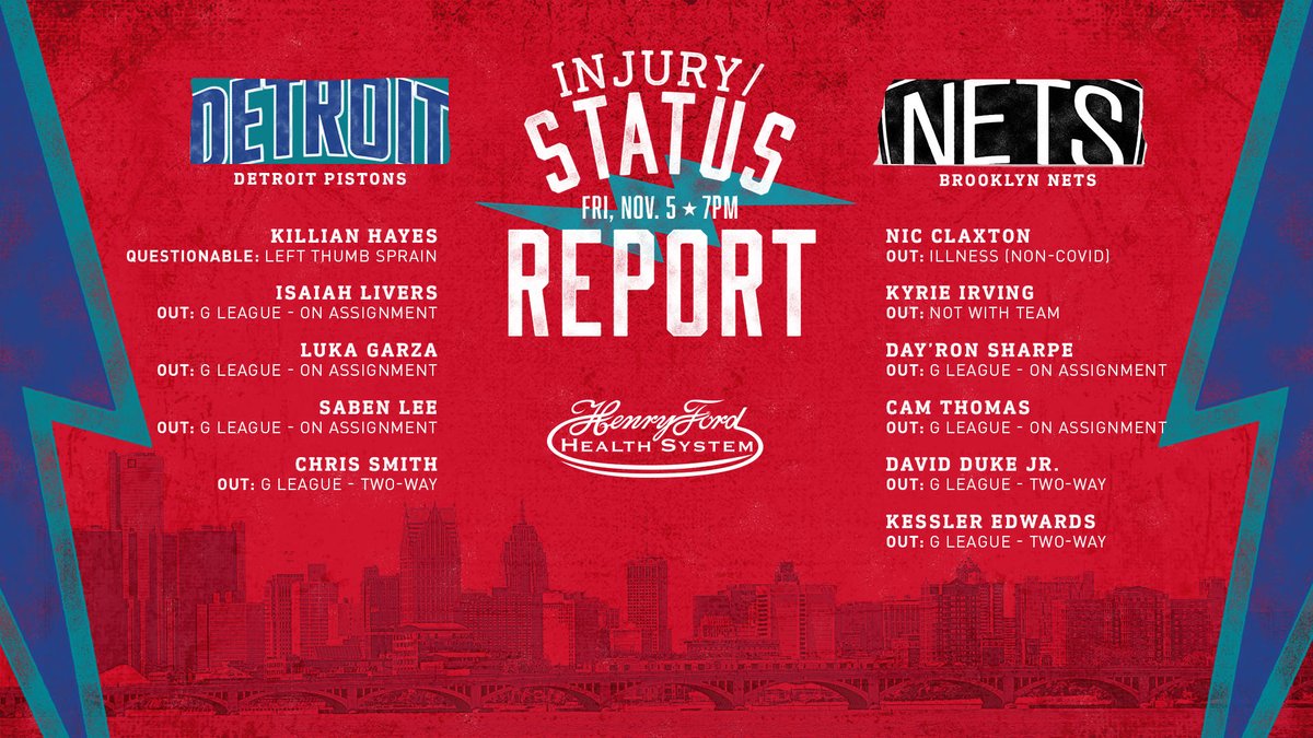 Tonight’s @HenryFordNews injury/status report against the visiting Brooklyn Nets: pic.twitter.com/yuIKeN40As – 5:55 PM