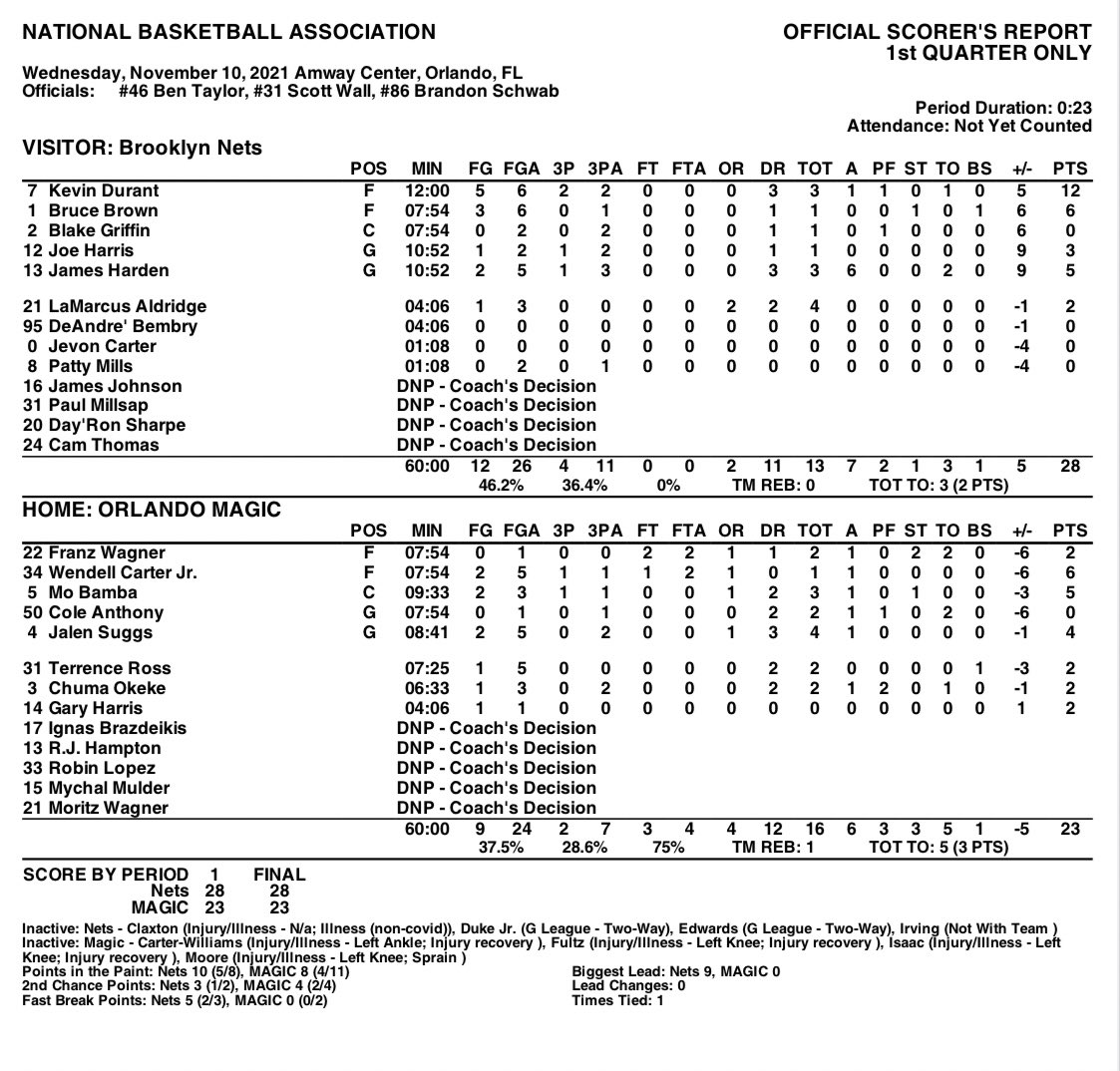 END OF 1ST QUARTER BOX: Brooklyn 28, Orlando 23 pic.twitter.com/asQpSfXGcn – 7:35 PM