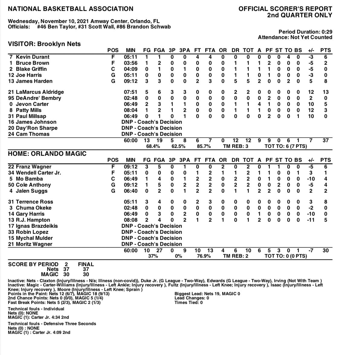 Kevin Durant (12 PTS, 3 REBS), James Harden (5 PTS, 6 ASTS) and the Nets are looking good. They’re outscoring Orlando 10-8 in the paint and have forced 5 turnovers. It’s only a matter of time before this offense heats up. – 7:35 PM