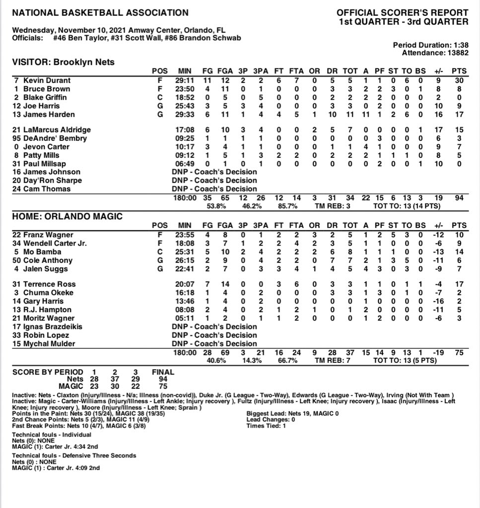 END OF 3RD QUARTER BOX: Brooklyn 94, Orlando 75 pic.twitter.com/xHwWouatoJ – 8:55 PM