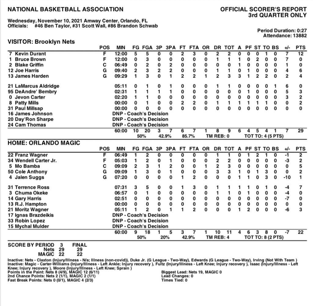 Despite shooting just 40% from the field, and 14.3% from 3-point range, the Magic only trail the Nets by 12 with 3:32 to go in the 3rd. – 8:38 PM
