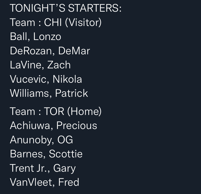 Oh yeah, there’s a Raptors game tonight, they’ll start VanVleet, Trent, Barnes, Anunoby, Achiuwa