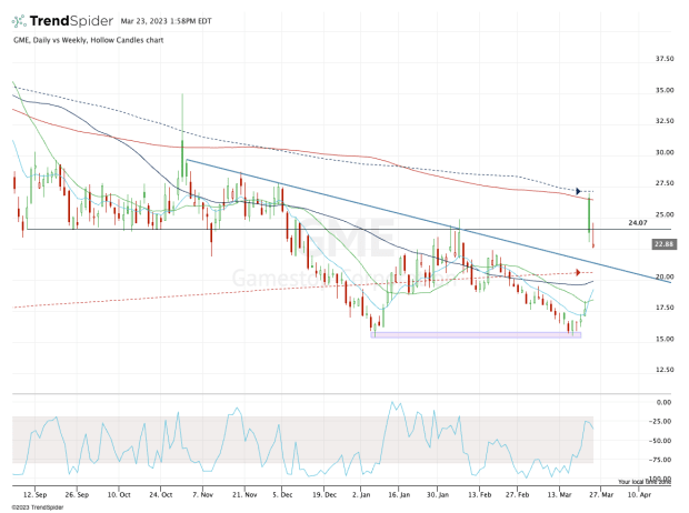 That comes into play just above the 10-day, 50-day and 200-week moving averages, which would technically be in play should GameStop correct down toward $21.