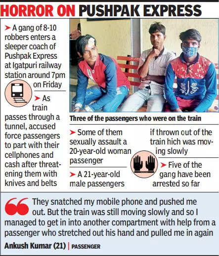 As the train entered a long tunnel after Igatpuri, the robbers, taking advantage of the cover of darkness, threatened passengers in the general coach with belts and metal knuckles, forcing them to part with their belongings, said passengers. Some of them whipped out knives soon after the train had left Igatpuri station, some of the passengers told TOI.